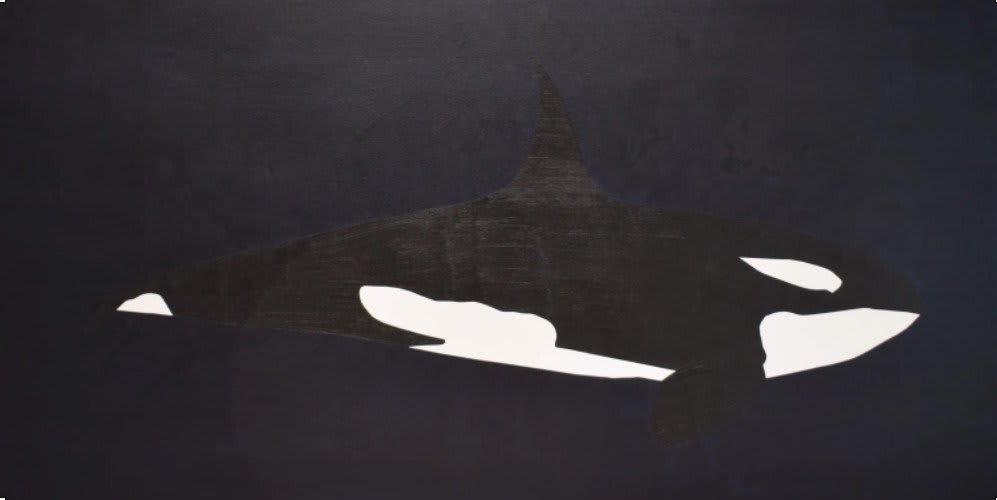Painted in black and white with deep blue background, 2 meters wide and 1 meter tall.